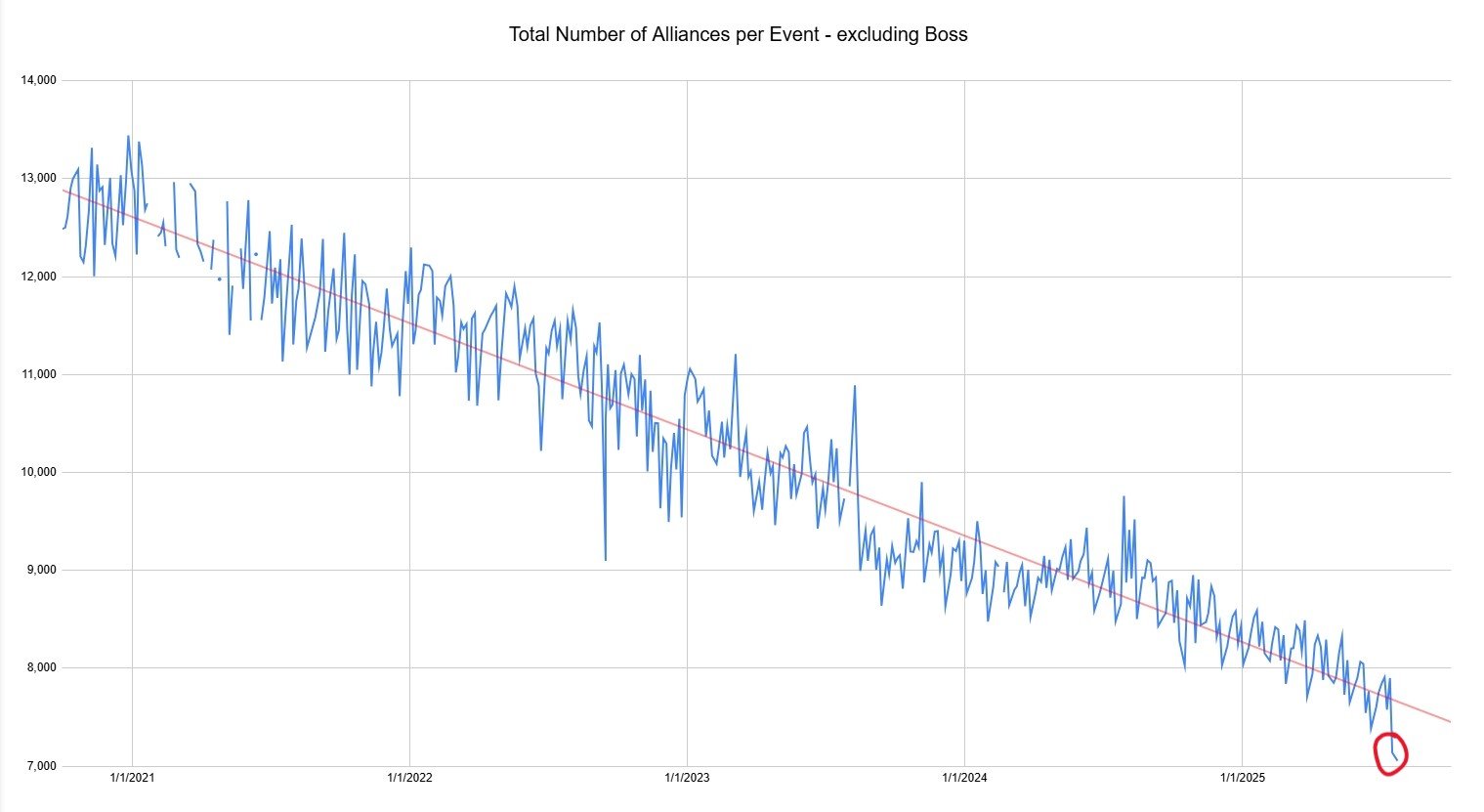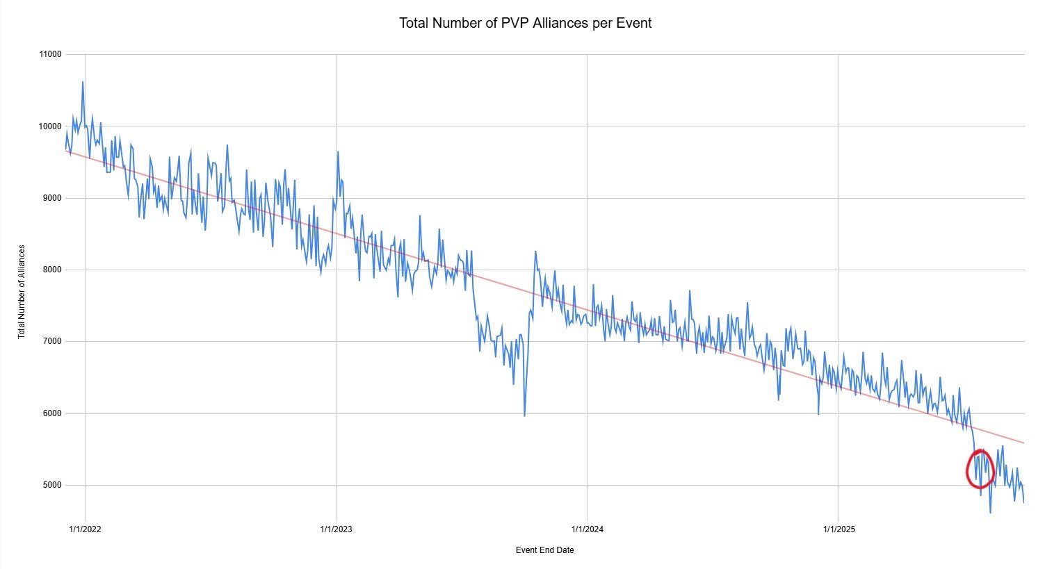 As a reminder, I left out the last data point for PVE even though it fell off the graph. I've actually had to adjust the scaling twice now, both times lower, since Unity was released! The last recorded number for PVE was 6,770 alliances, which is the lowest on record. It's most likely lower now, however, since events disappear immediately after they end due to Unity, the data collection has stopped unfortunately. If players in the earlier slices (S1-S4) could share the final numbers for PVE, we could continue tracking this information.