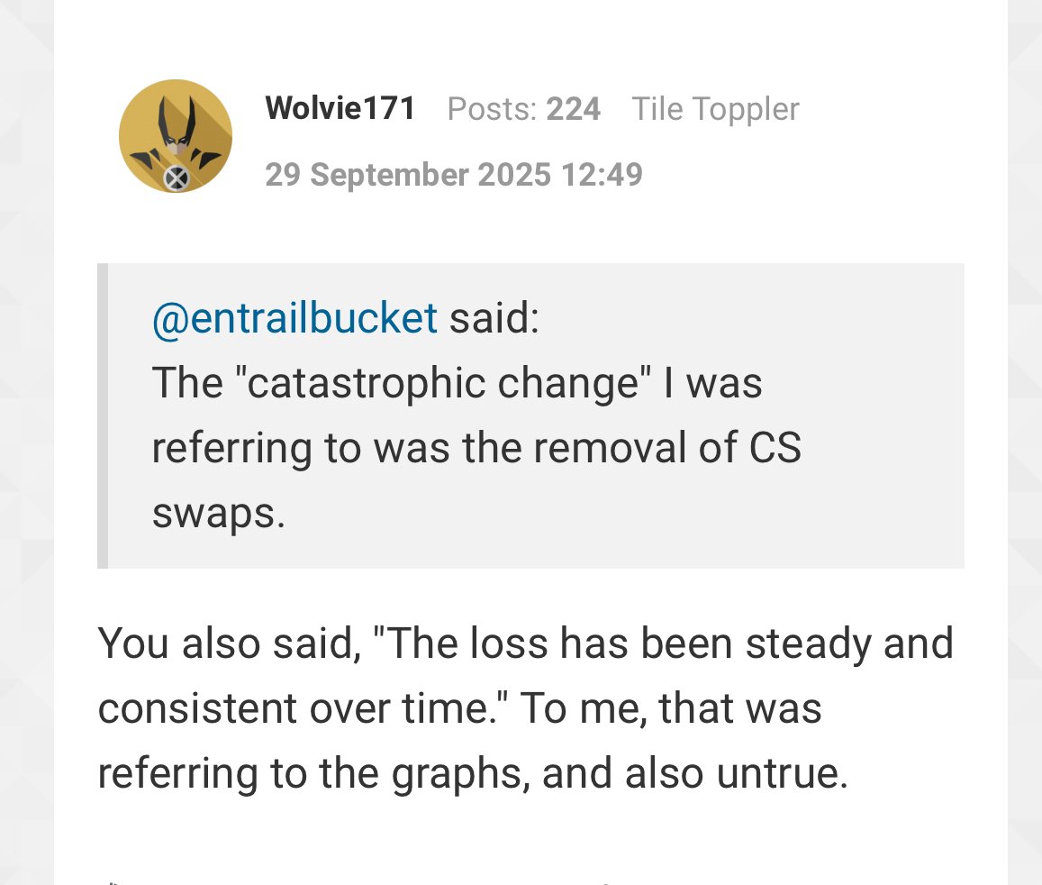 Wolvie quoted and responded to my original post with his graphs, not yours. And then YOU chose to respond to his post about declining alliances. It’s the opposite of what you claim. You chose to engage with him about the graphs, not the other way around.