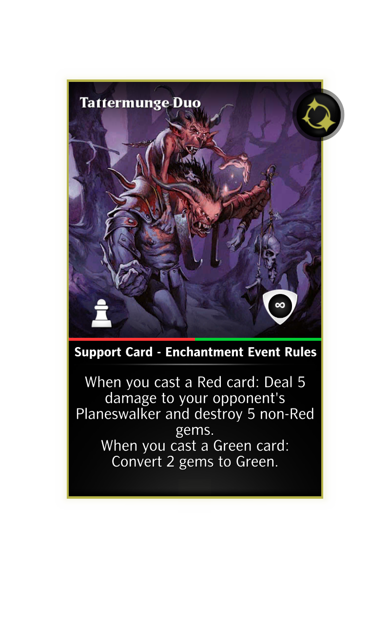 - Rakdos, Patron of Chaos - "At the end of your turn: Destroy a random opposing creature. If you can't: Destroy an opposing nonSimple support. This effect can affect Vanguard supports. Then: Reinforce this creature.” → “At the end of your turn: Destroy an opposing non Simple support. This effect can affect Vanguard supports. If you can't: Reinforce this creature.”