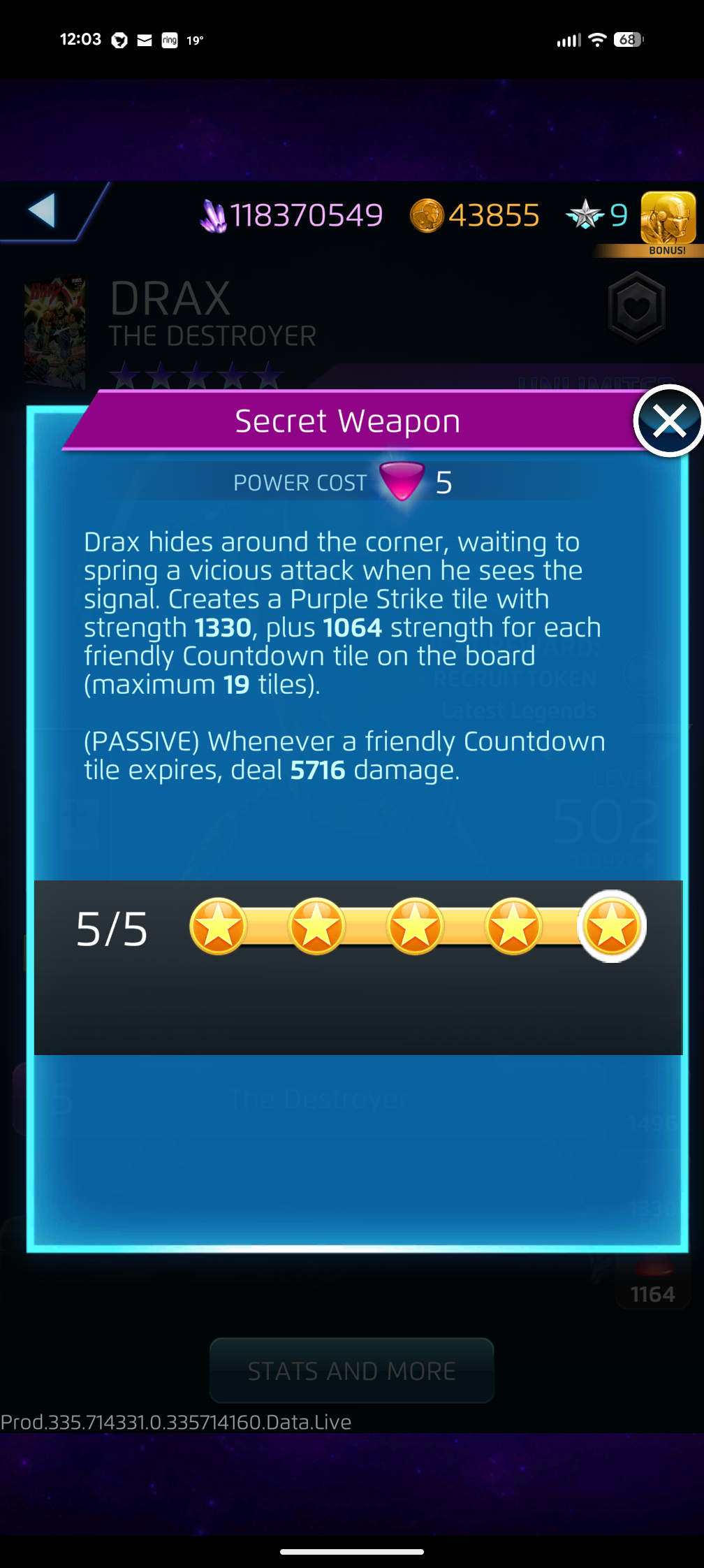 Drax still isn't very good, even after the buff. Mine is 502 unboosted here:
